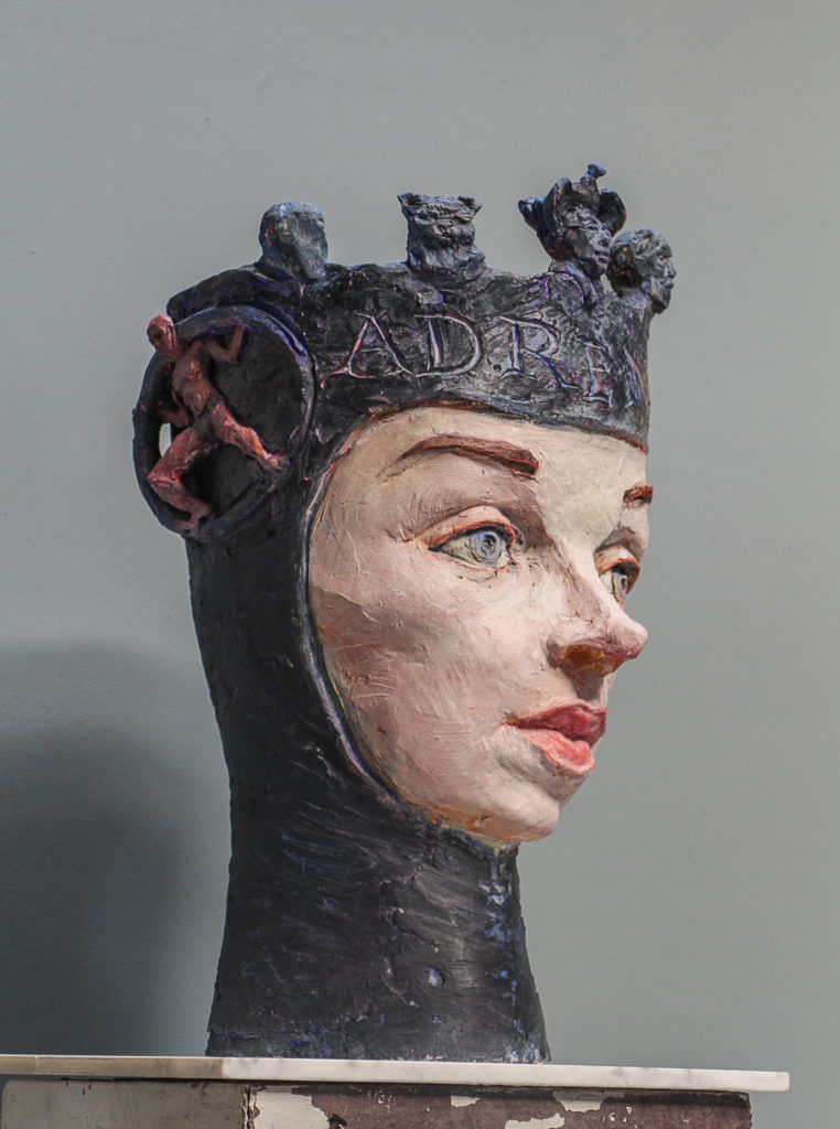 The portrait heads are fired clay, usually twice life-size, using the hand-built approach, using slabs or coils. Instead of accurate portrayals, these are Playful yet still very personal. They are typical of individuals that I find